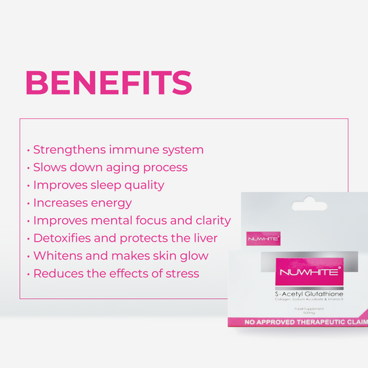 Nuwhite uses S-Acetyl Glutathione that ensures maximum potency and maximum absorption just like glutathione IV drips, but in a more accessible, more convenient, more affordable way! Just take 1 capsule a day for that power whitening dose.