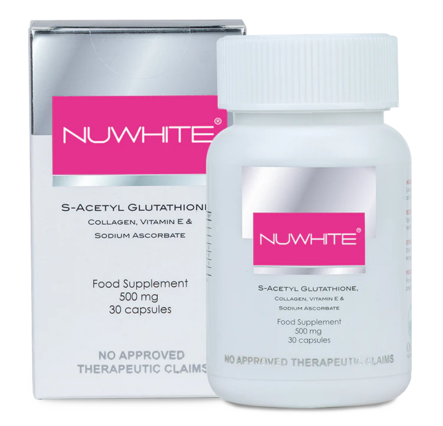 Nuwhite uses pure 200mg of patented S-Acetyl Glutathione from Europe that is 10x more powerful than other forms of glutathione. This means that 200mg is equal to 2000mg of reduced L-Glutathione. 1 capsule a day is enough.